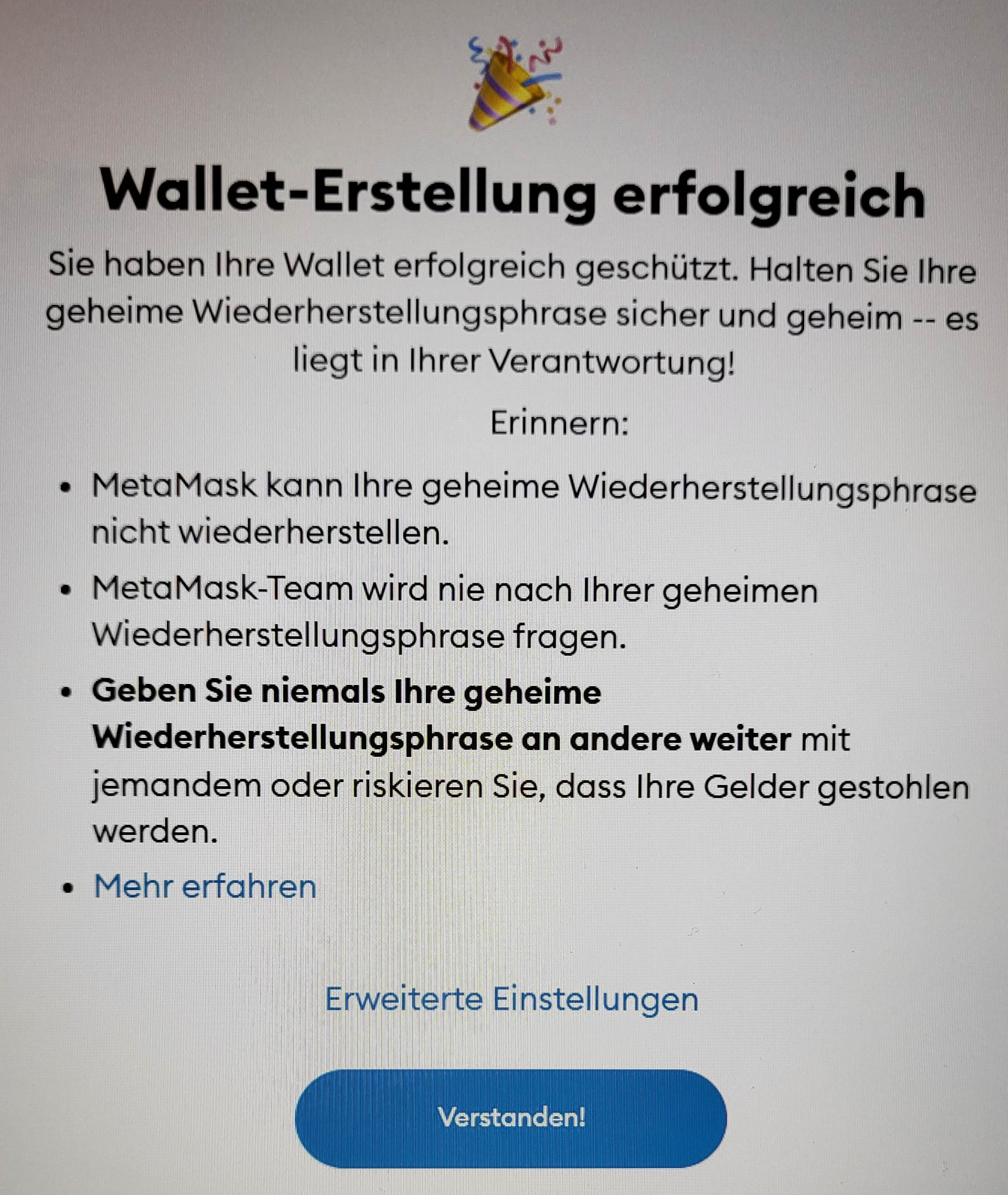 MetaMask weisst jetzt nochmals darauf hin, dass Sie bei verlorenen Daten keine Hilfe erwarten können.