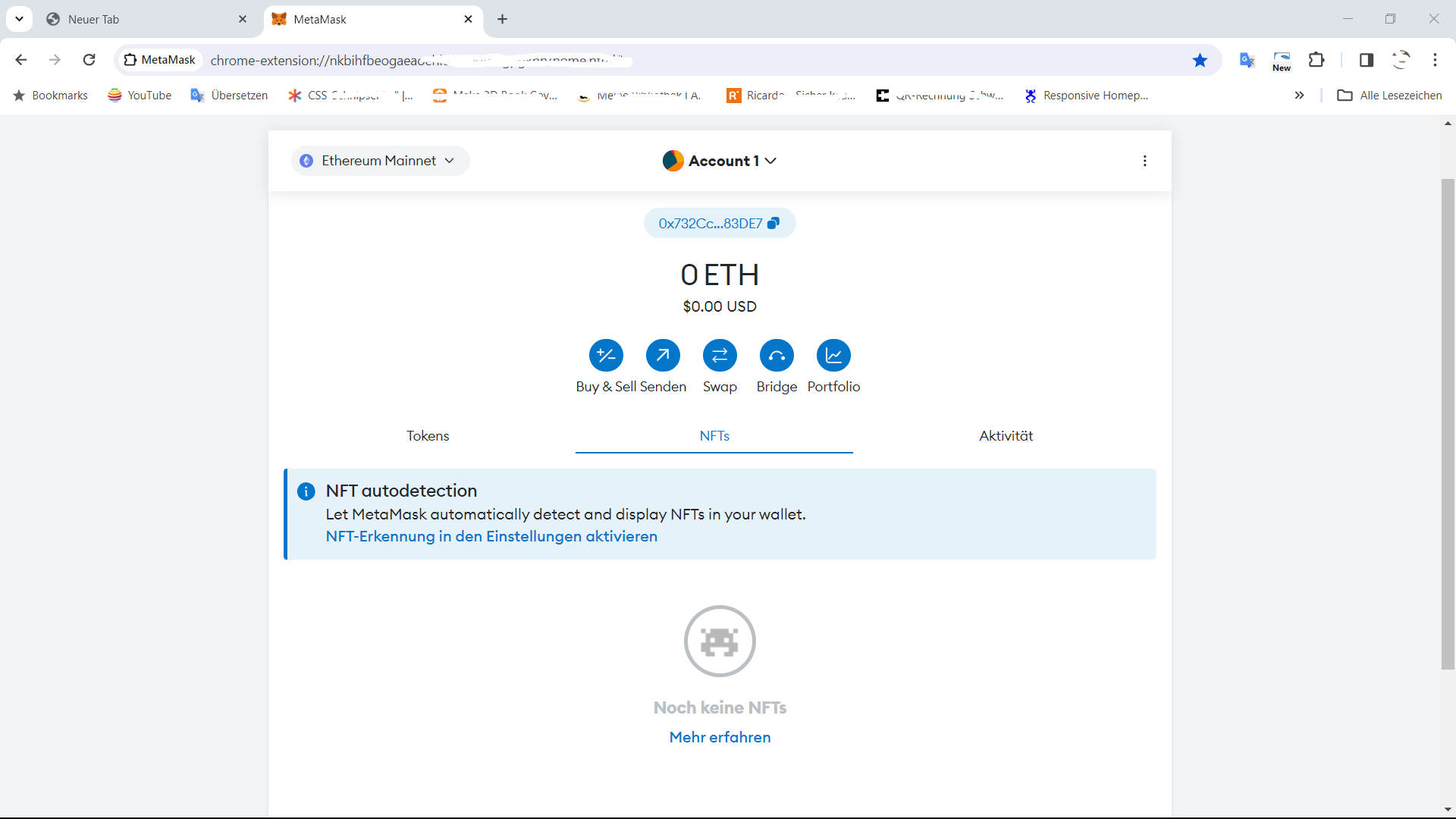 So wird Ihre Wallet in etwa aussehen, wenn Sie das "Füchsli" in der Erweiterung im Browser öffnen.