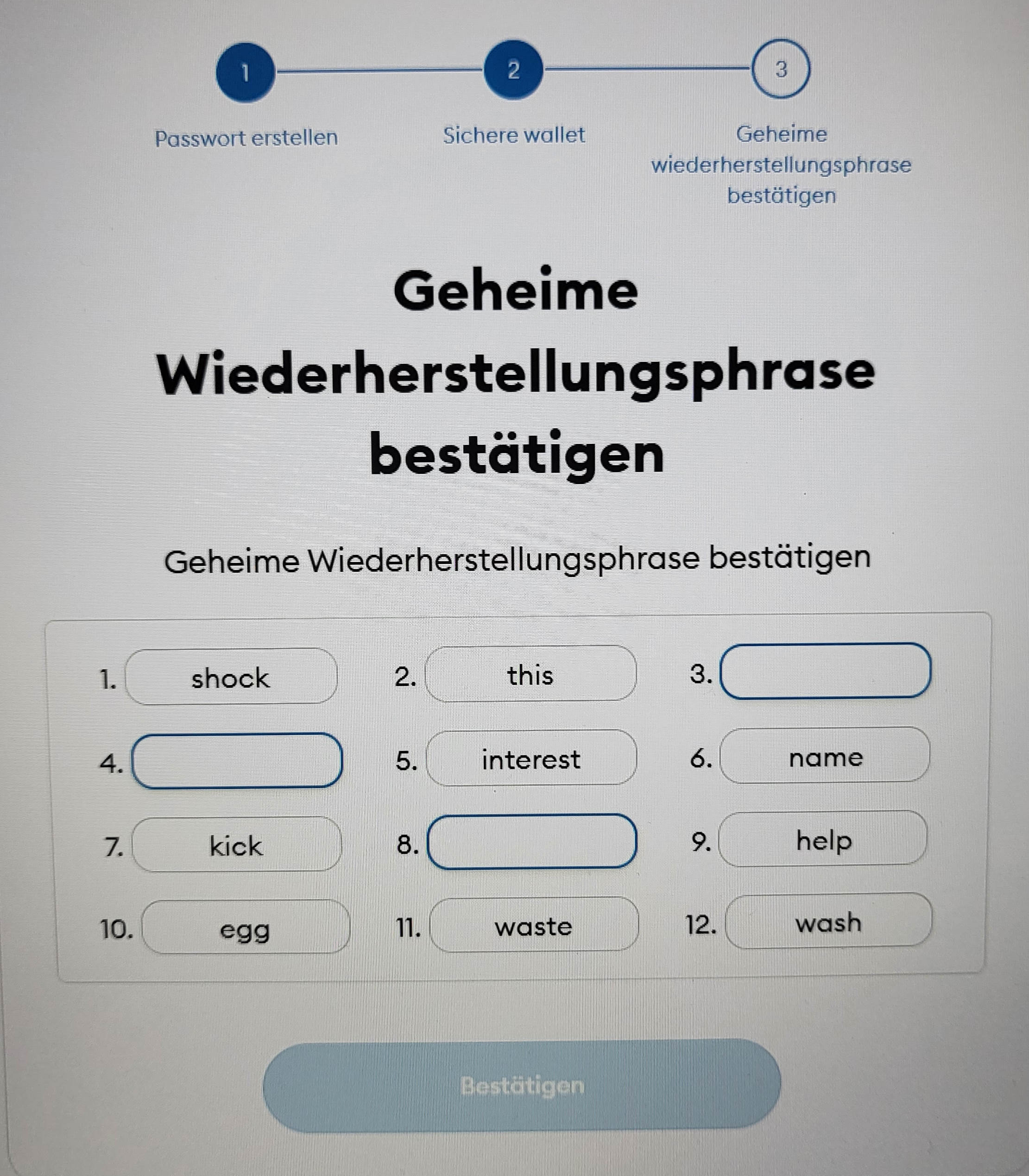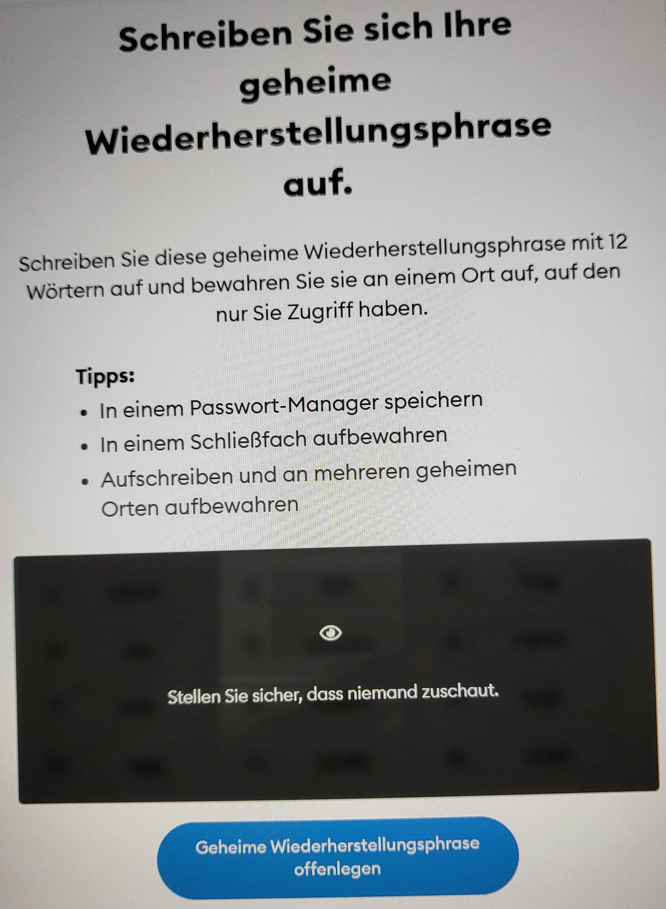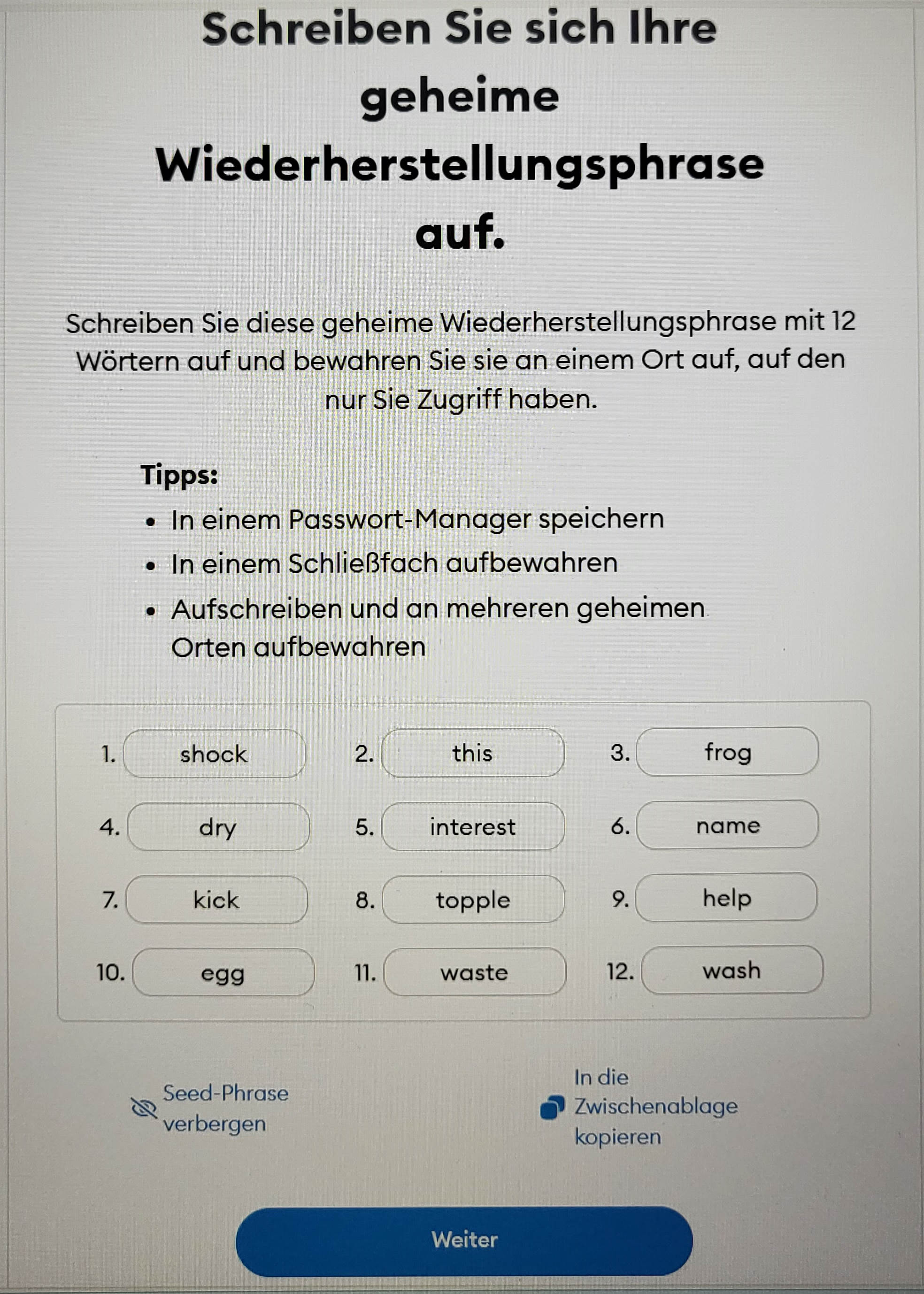 Die Wiederherstellungsphrase besteht aus 12 Wörtern, bitte gut aufbewaren.